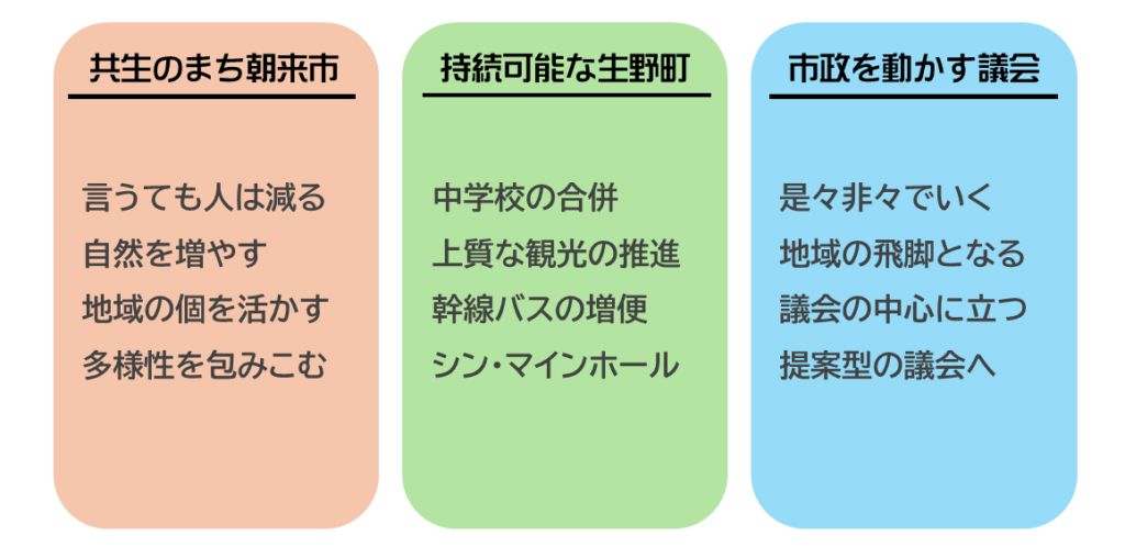 加藤の目指す朝来市政は以下の通りです。ぜひ、みなさんのご意見を反映して市長に提案していきたいと思います。どしどしご意見ください。